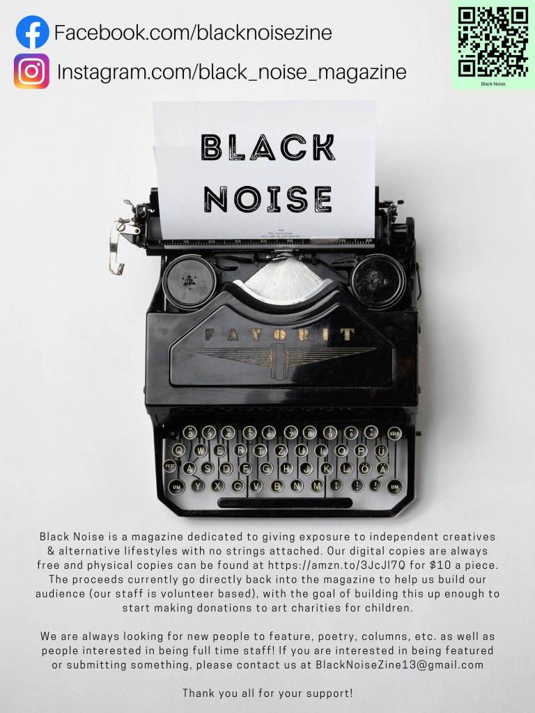Black Noise Magazine BooksPoetryFor Legal Reasons this is FictionWelcome to the Worst DirectionBlack Noise MagazinePhotographyAbout Black Noise – The Magazine of Independent Artistry & Intriguing Degenerates! /blacknoisezine.com/ Share this: Share on X (Opens in new window) X Share on Facebook (Opens in new window) Facebook Like Loading...